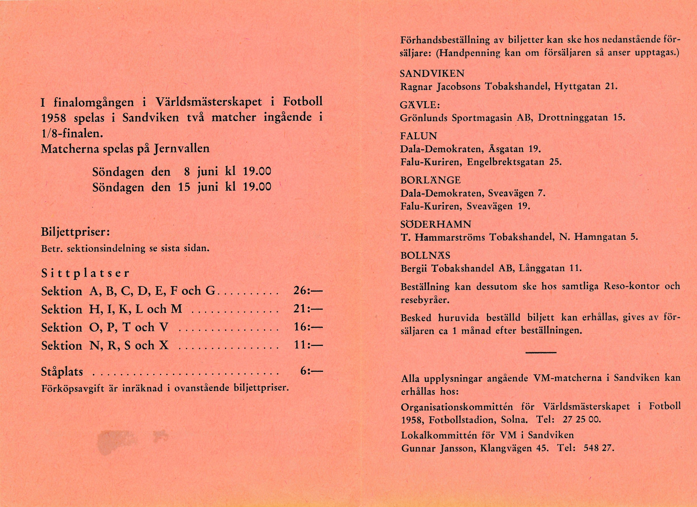 1958 spelades fotbolls-VM på Jernvallen i Sandviken. Totalt 30 000 åskådare såg matcherna mellan Ungern-Wales och Ungern-Mexiko i Sandviken när fotbolls-VM spelades i Sverige 1958.