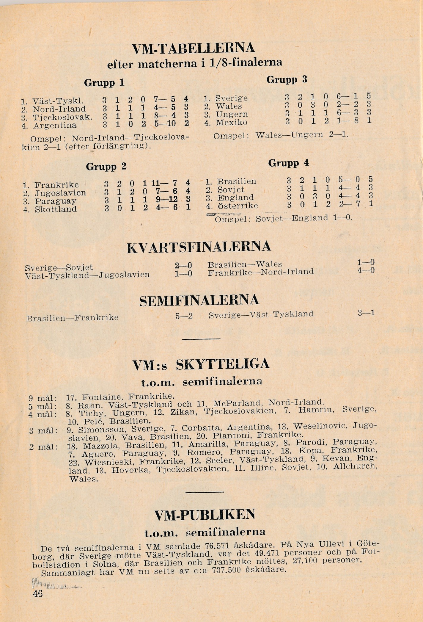 Också Sverige hade en hel del att fira. VM-silvret var den största framgången någonsin, och turneringen hade varit en ekonomisk och organisatorisk succé. Att Brasilien vann guldet ansågs vara synnerligen rättvist, och att de gjort det på ett publikfriande och sportsligt sätt gjorde finalförlusten lätt att bära för både landslag och publik. Källa: Wikipedia Youtube.