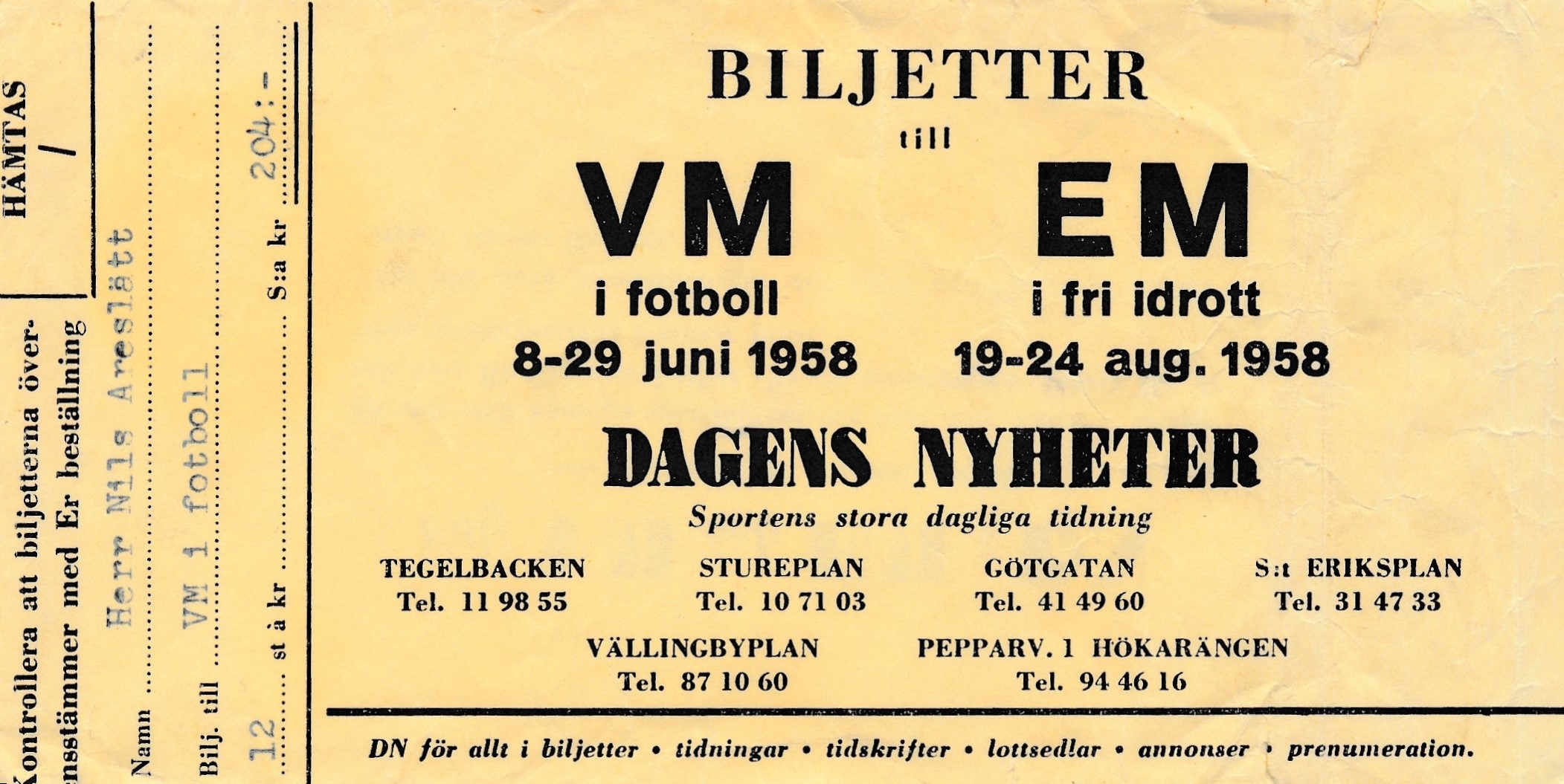 Världsmästerskapet i fotboll 1958 spelades i Sverige under perioden 8–29 juni 1958. Brasilien vann turneringen genom att besegra Sverige med 5–2 i finalmatchen medan Frankrike slog Västtyskland med 6–3 i matchen om tredje pris. Mästerskapet är ihåg kommet för att det blev Brasiliens första VM-guld, att Argentina valde att delta i VM för första gången sedan 1934 och att alla de brittiska landslagen deltog. Dessutom var det fotbolls giganten Pelés första världsmästerskap. Källa: Wikipedia.