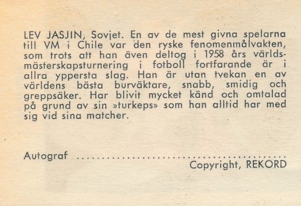Lev Ivanovitj Jasjin (ryska: Лев Инанович Яшин), föddes den 22 oktober 1929 i Moskva, dåvarande Sovjetunionen och dog den 20 mars 1990. Jasjin var en fotbollsmålvakt. Mellan 1954 och 1970 spelade Jasjin 74 landskamper för det sovjetiska landslaget och deltog bland annat i fyra VM-turneringar. Han blev framröstad till århundradets bästa målvakt av International Federation of Football History & Statistics. (Youtube)