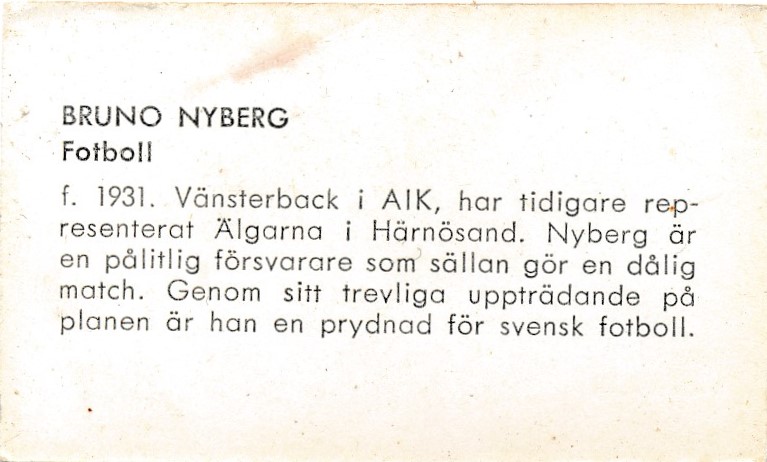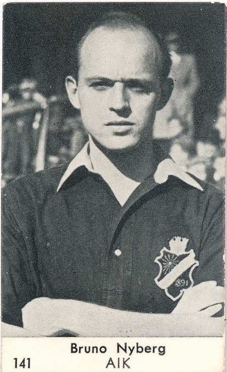 Bruno Rolf "Älgen" Nyberg (1 juni 1931–8 juni 2013) var en respekterad vänsterback i AIK under 1950‑talets mitt – med en matchstatistik på 123 matcher och 6 mål i Allsvenskan. Hans styrka låg i defensiva insatser och spelförståelse, och han debuterade redan 1953 i en klassisk derbyseger mot Djurgården. Efter spelarlivet fortsatte han att ha stort inflytande inom klubben i ledande roller. Utanför fotbollen hade han en stabil karriär inom finanssektorn och var familjefar till tre barn. Källa: AI