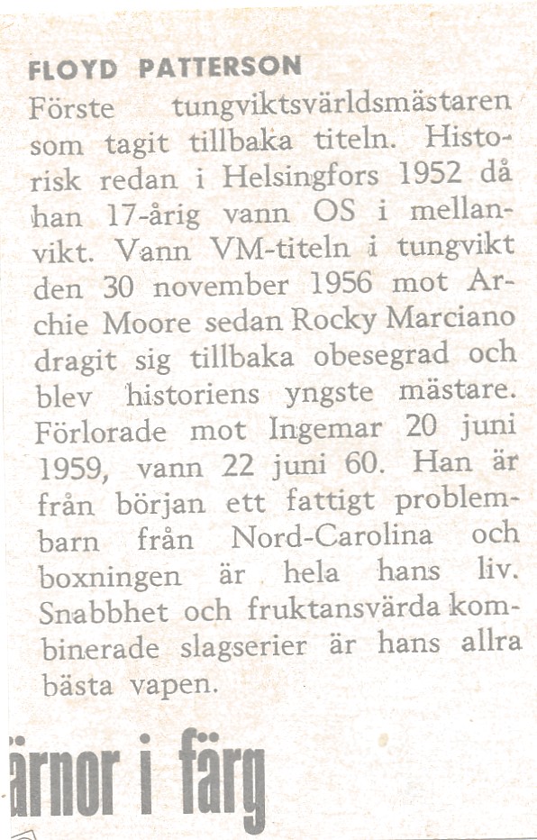 Trots att Floyd Patterson besegrade Ingemar Johansson i två av deras tre möten blev Patterson mycket populär i Sverige. Han fick mängder med beundrarbrev från svenska "Floyd-fans" och han besökte Sverige många gånger efter att han gick matcherna mot Ingemar Johansson; hans ena bror Raymond var bosatt i Göteborg (Torslanda). I likhet med Ingemar drabbades han av demens av den för boxare vanliga typen dementia pugilistica. Andra legendariska boxare som drabbats av denna sjukdom är Muhammad Ali och Joe Louis.