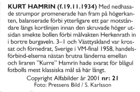 Kurt Hamrin var Sveriges bäste högerytter under större delen av 1950- och 1960-talen. Han var en av stjärnorna när Sverige gick till VM-final på hemmaplan 1958 (Youtube). I semifinalen på Nya Ullevi gjorde han ett konstmål där han på egen hand gick igenom det västtyska försvaret och befann sig på kortlinjen varifrån han skruvade in bollen i mål - en klassiker bland svenska fotbollsmål, (Youtube) dock med god hjälp av Lennart Hylands målande radioreferat.