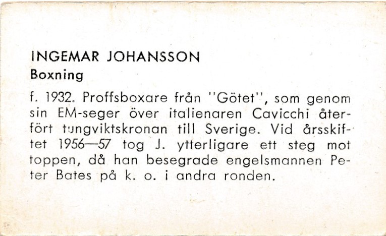 Intresset för boxning fick Ingemar Johansson då han på vinter/våren 1945 såg en boxningsmatch i Mässhallen: "Jag stod överst i Mässhallen, såg ned i ringen och häpnade att folk var så tagna. De skrek som tokiga och jag förstod inte vad det var, som engagerade dem så våldsamt. Men skådespelet fångade mig, publikens rop fick samband med slagväxlingarna. Plötsligt stod det klart för mig, att jag hade lust att bli en av figurerna i ljusvalvet under lamporna. Hjärtat började banka i mig, när jag upptäckte, att jag ville bli boxare."