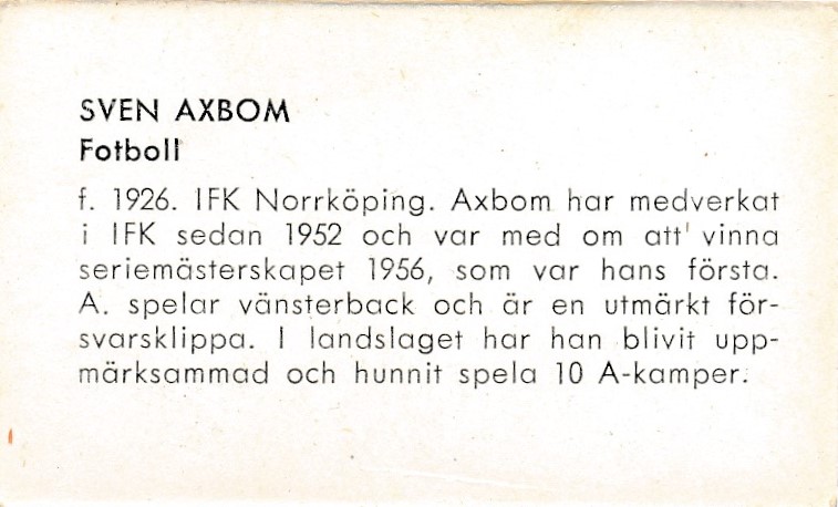 Sven Axbom, född 15 oktober 1926, död 8 april 2006 spelade som vänsterback i det svenska landslag som tog silver i världsmästerskapet i fotboll 1958. Inom klubbfotbollen spelade han bland annat som back för IFK Norrköping.