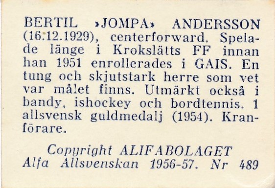 "Jompa" debuterade i A-laget 1951 tillsammans med Gösta "Knivsta" Sandberg i en match mot Gais, där båda skrev in sig i målprotokollet direkt. Under sin tid i Djurgårdens IF spelade han 123 seriematcher och gjorde 69 mål – en imponerande målskörd som gör honom till en av klubbens bästa målskyttar genom tiderna. Han var en klassisk centertank: stark, målfarlig, med en vass näsa för mål och ett huvudspel utöver det vanliga.