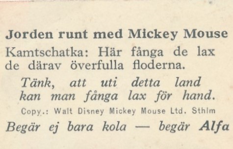 Alfa Bobbykola svenska Disney-serien 1935 med titeln ′′ Jorden runt med Mickey Mouse ′′ serien består av 150st kort.