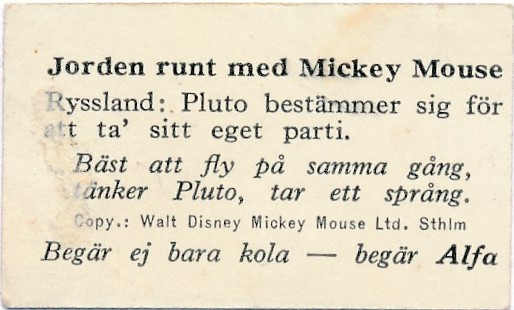Alfa Bobbykola svenska Disney-serien 1935 med titeln ′′ Jorden runt med Mickey Mouse ′′ serien består av 150st kort.