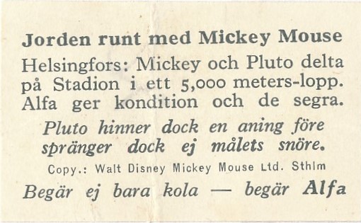 Alfa Bobbykola svenska Disney-serien 1935 med titeln ′′ Jorden runt med Mickey Mouse ′′ serien består av 150st kort.